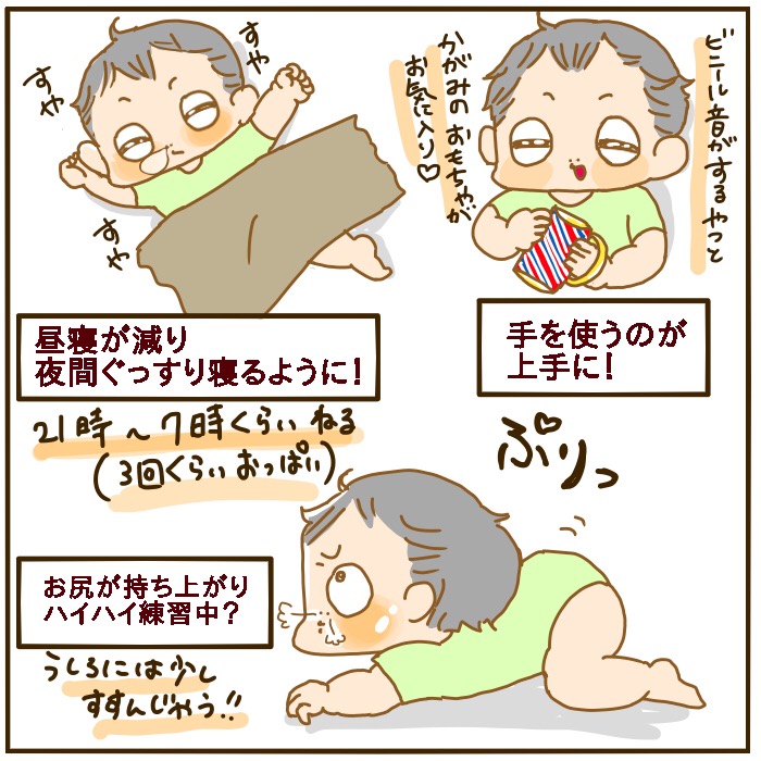うちの息子も4/7生まれなので生後5ヶ月になり、寝返りでいつの間にかに移動できるようになっていて嬉しいと同時に『成長が早い、さみしぃ~』とよく主人と話しています👶👶